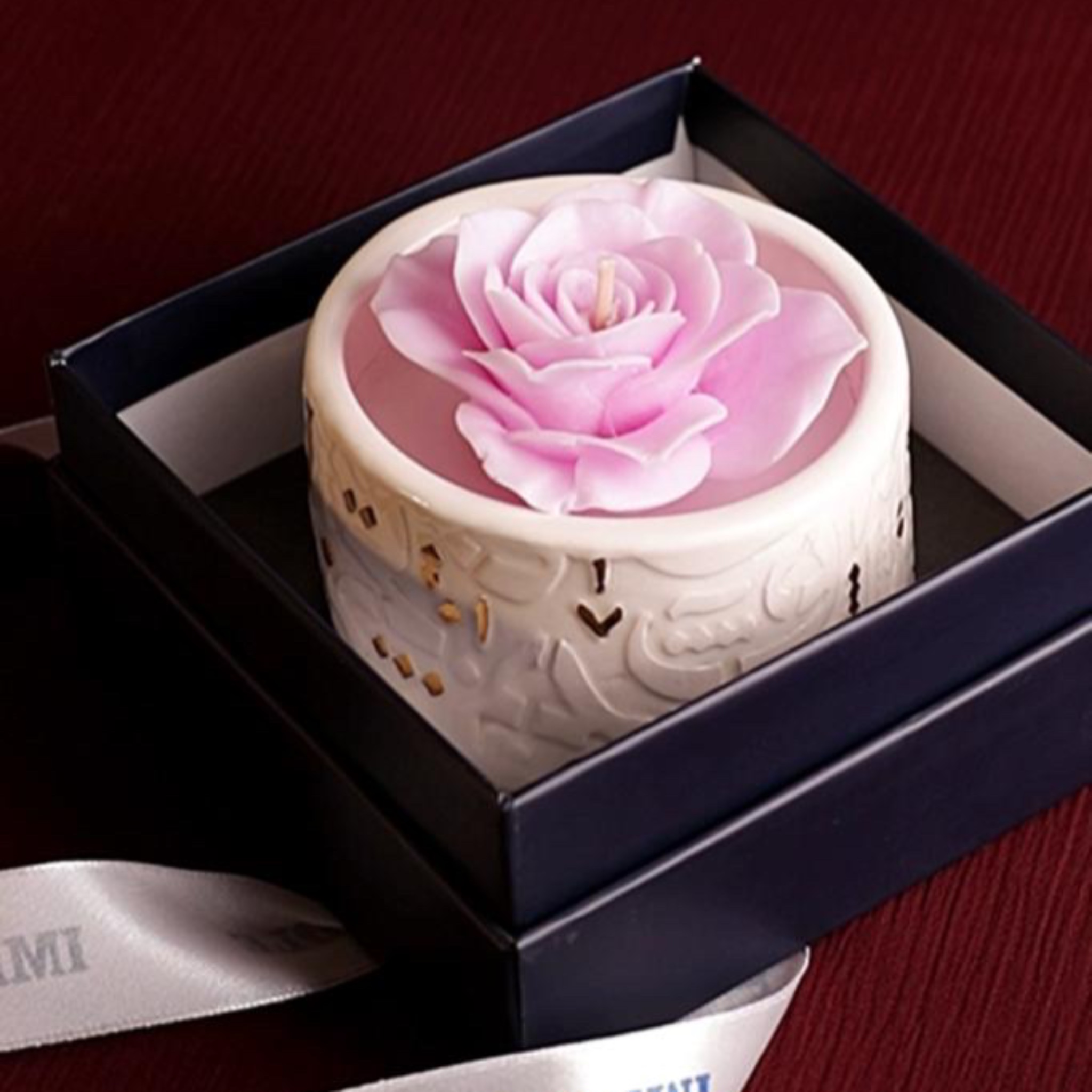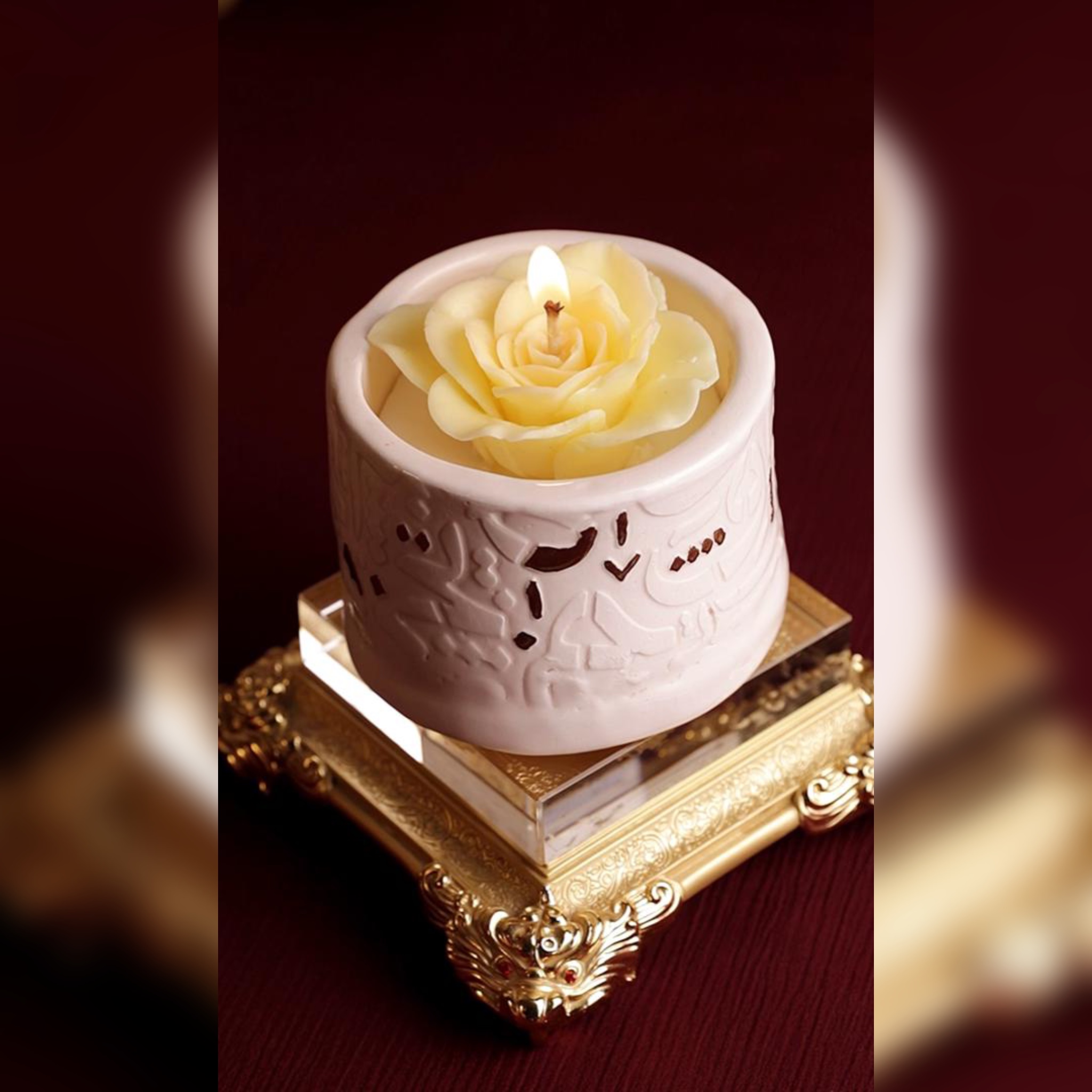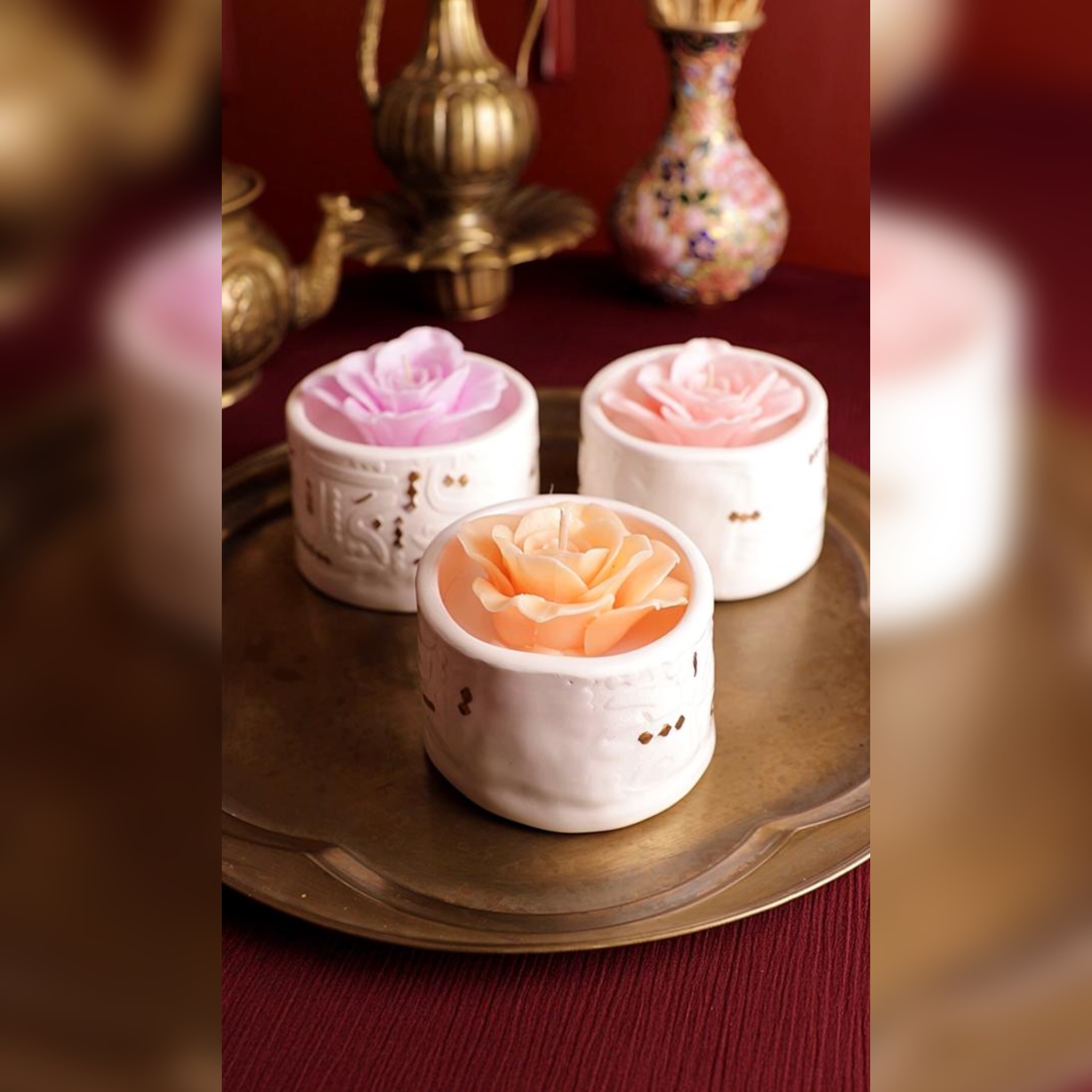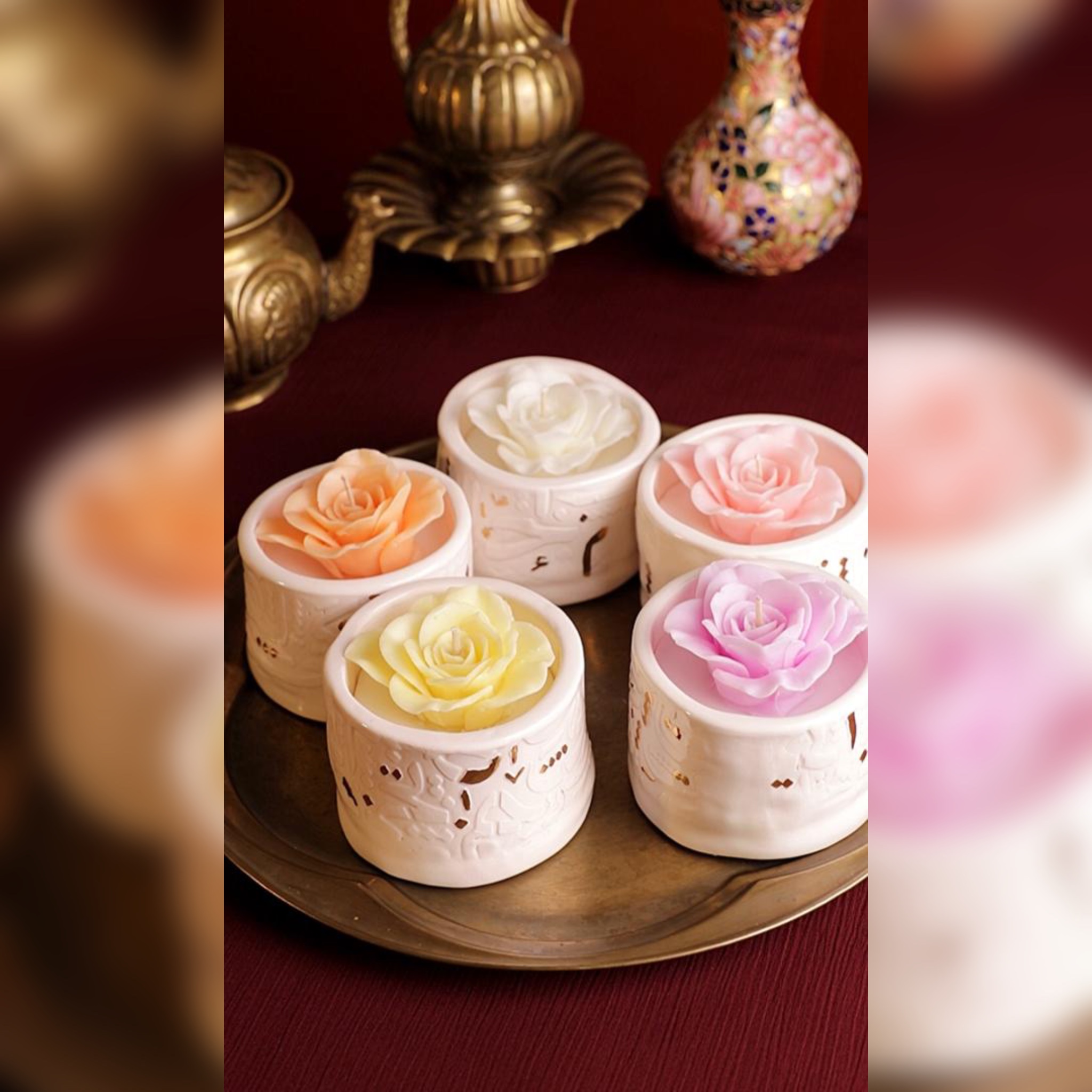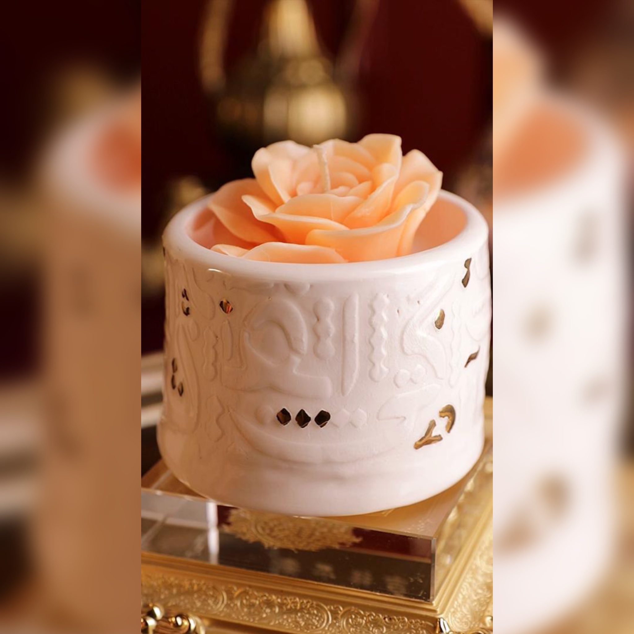 - در قلب شمع، گلی رزگونه از موم شکفته است؛ گلی که با دست، گلبرگبهگلبرگ ساخته شده و در رنگهای لطیف هلویی، صورتی، سفید، زرد و یاسی جلوه میکند. هر رنگ، داستانی از احساس دارد: گرمای عشق در هلویی، نرمی آرامش در سفید، شادی در زرد، و نجابت در یاسی.